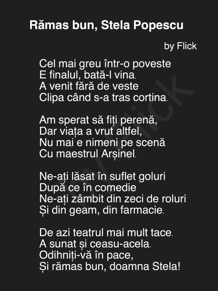 La nici cateva ore de la moartea artistei, Flick, cunoscut ca si "Domnul Rima", a scris o poezie in stilu-i caracteristic despre marea actrita Stela Popescu. Versurile, chiar daca simpliste, sunt extrem de emotionante si nu au cum sa nu transmita emotie, mai ales in randul celor care au apreciat-o pe Stela Popescu.
