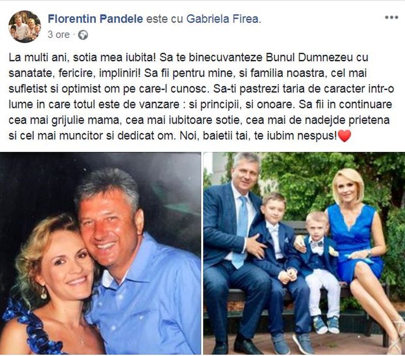 ”La mulți ani, soția mea iubită! Să te binecuvânteze Bunul Dumnezeu cu sănătate, fericire, împliniri! Să fii pentru mine și familia noastră cel mai sufletist și optimist om pe care-l cunosc. Să-ți păstrezi tăria de caracter într-o lume în care totul este de vânzare: și principii, și onoare. Să fii în continuare cea mai grijulie mamă, cea mai iubitoare soție, cea mai de nădejde prietenă și cel mai muncitor și dedicat om. Noi, baieții tăi, te iubim nespus!”, a scris Pandele pe rețeaua de socializare.