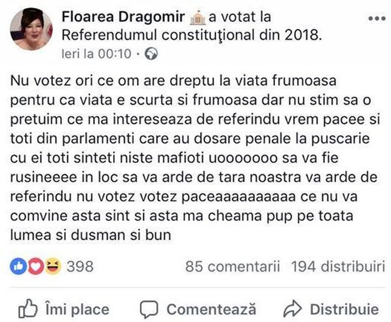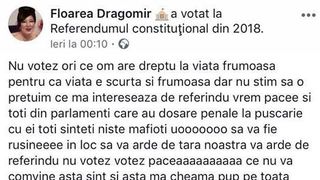 Floarea Dragomir, cunoscută publicului din România sub numele de Floricica Dansatoarea, a transmis, sâmbătă, pe pagina de Facebook, un mesaj prin care şi-a exprimat părerea despre referendumul pentru definirea familiei.