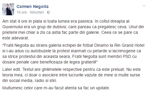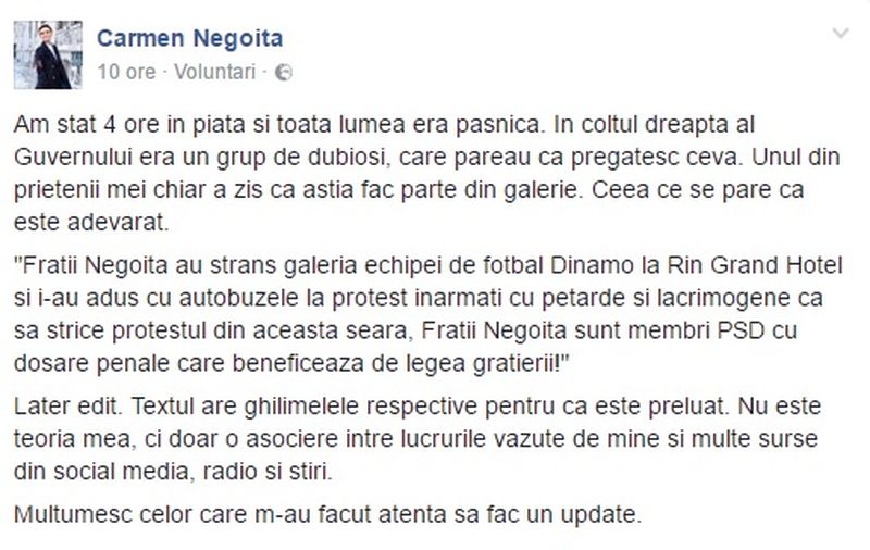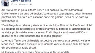 Carmen Negoita, fosta sotie a patronului FC Dinamo Bucuresti, Ionut Negoita, a scris pe contul sau de Facebook ca "Fratii Negoita au strans galeria echipei de fotbal Dinamo la Rin Grand Hotel si i-au adus cu autobuzele la protest inarmati cu petarde si lacrimogene ca sa strice protestul din aceasta seara, Fratii Negoita sunt membri PSD cu dosare penale care beneficeaza de legea gratierii!"