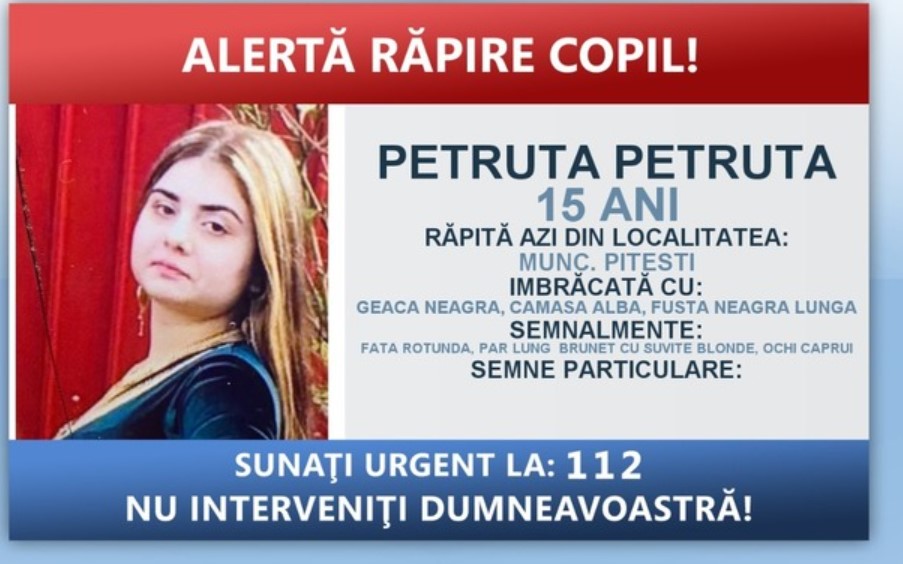 Autorităţile au intrat în alertă și caută o fată de 15 ani din Piteşti care a fost urcată într-o maşină de trei persoane necunoscute. A fost declanșat mecanismul ”Alertă răpire copil”.