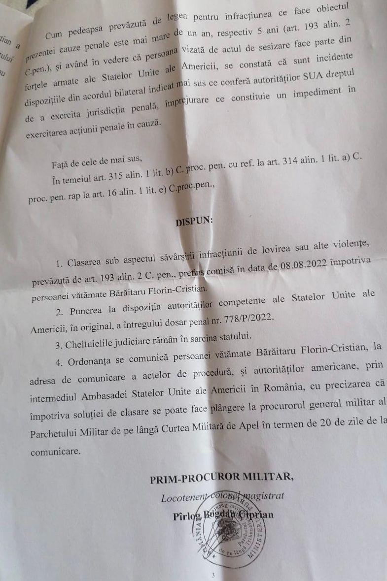 Avocatul Adrian Cuculis a spus că această clasare a fost dispusă de procurorul militar, ca urmare a renunțării țării noastre la jurisdicția penală asupra soldaților SUA staționați pe teritoriul național.