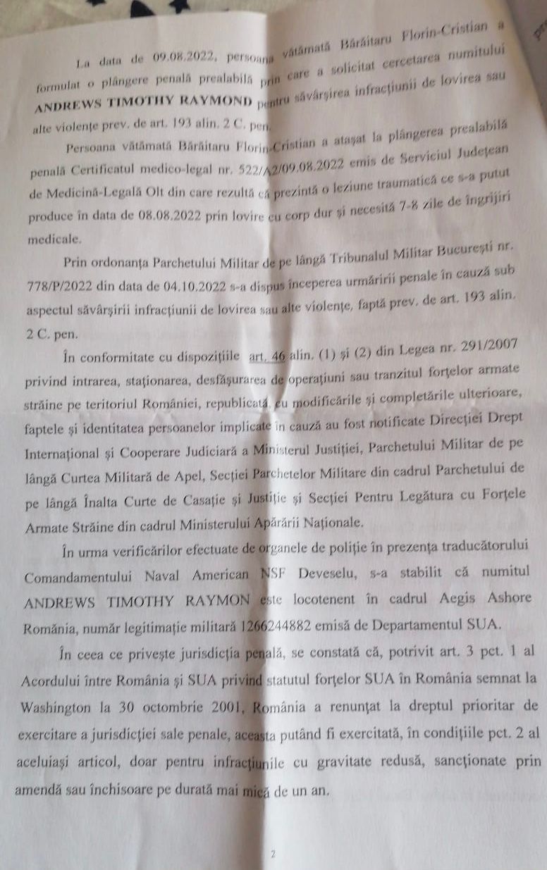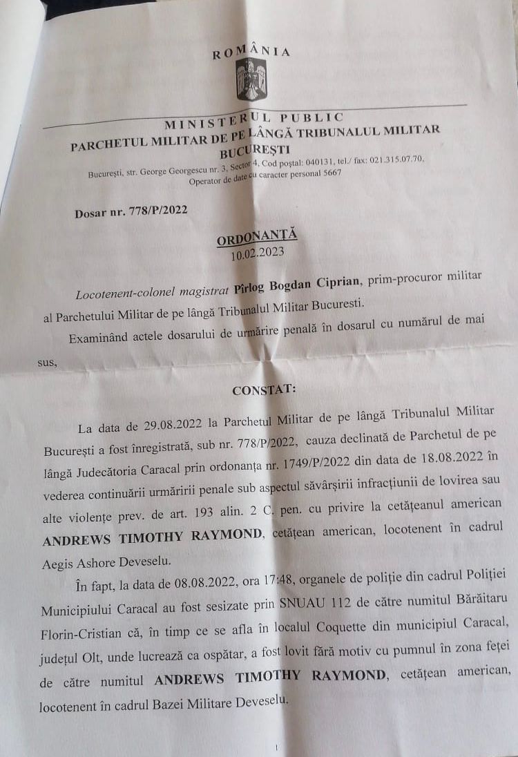 Incidentul s-a petrecut în anul 2022, când chelnerul de la un restaurant din Caracal a fost luat la bătaie de soldatul american. Persoana vătămată a făcut o plângere penală pe numele americanului, iar procurorul a clasat-o.
