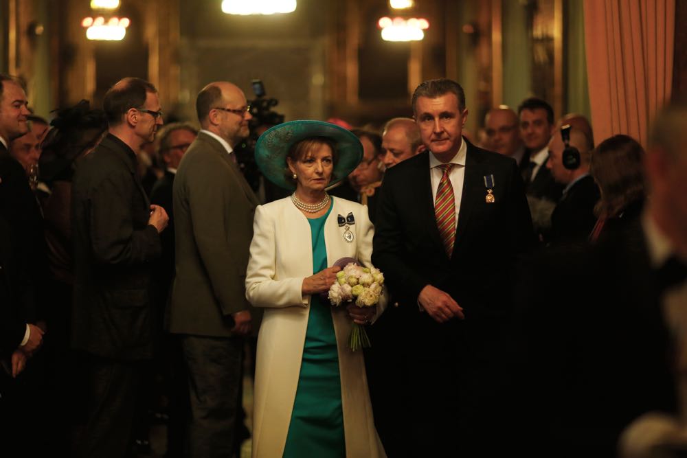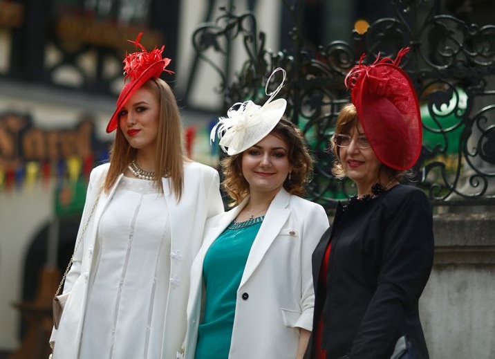 Domni la costum, doamne in tinute elegante la care au accesorizat cate o palarie, au umplut pajistea din fata Castelului Peles din Sinaia. A fost o adevarata parada a palariilor sau a altor accesorii de pus pe cap, pentru ca au fost cateva doamne care au ales pene, fulgi sau voalete.