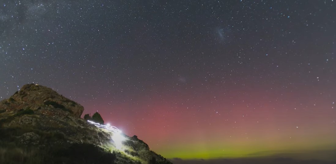 Vânătorii de aurore boreale au fost surprinși când au observat luminile colorate ale aurorei boreale din Noua Zeelandă.