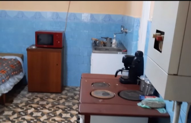 "Intrăm aici, în bucătăria de vară. Totul arată foarte bine. Avem unde să facem o cafea. Aici avem o sobă care e și centrală. E legat la gaz, are toate utilitătile. Acum intrăm. Este un hol foarte, foarte mare. Aici avem o nouă bucătărie, o baie cu tot ce trebuie. E centrală pe gaz. Baia e cu cabină de duș și boiler pe curent. Din hol, dăm într-o cămară mare, foarte răcoroasă.