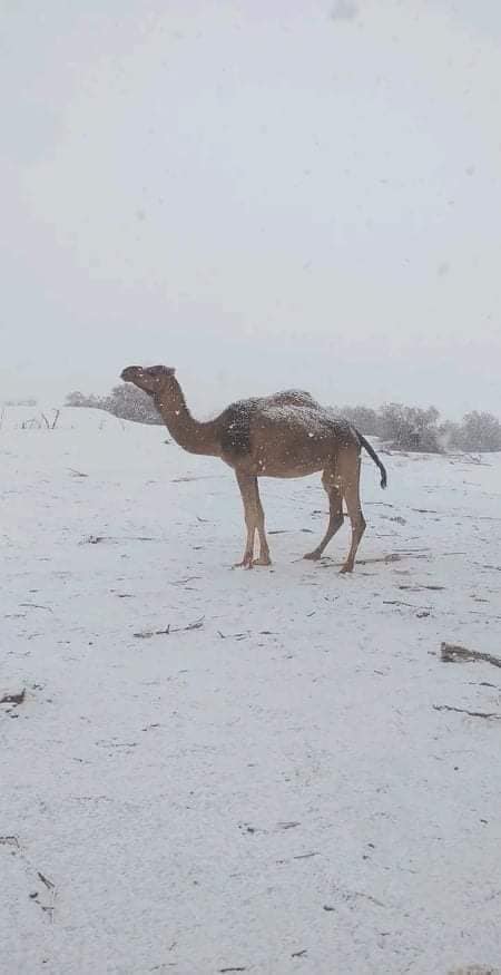În fotografii se vede chiar și o cămilă acoperită de zăpadă. În plus, prin nisipul fin al deșertului, acum se zăresc și fulgii de zăpadă care s-au așternut ca o pătură pufoasă.