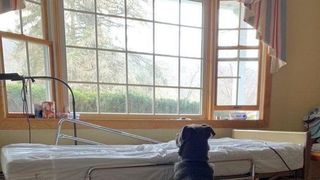 Câinele stă lângă patul de spital în care bărbatul care îi purta de grijă s-a zbătut între viață și moarte.