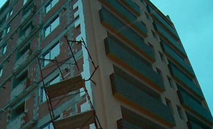 In imaginile surprinse de un locatar aflat in blocul de vis-a vis se poate observa cum schela se desprinde incet si apoi din cauza vantului puternic se prabuseste.