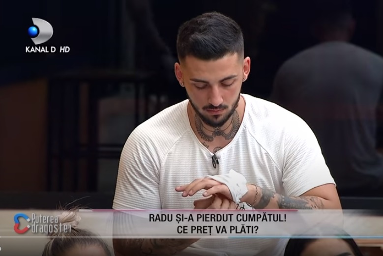 Radu s-a enervat foarte tare că nu a fost lăsat să vorbească și a spart ușa de la baie cu pumnul. A avut nevoie de un bandaj pe mână. "Vorbește aia anapoda și eu nu pot să vorbesc. Nu-mi convine să rămână ca ea de 100 de ori. Să o să las pe aia să mă umple pe mine cu minciuni și eu să tac?", s-a descărcat concurentul din emisiune.