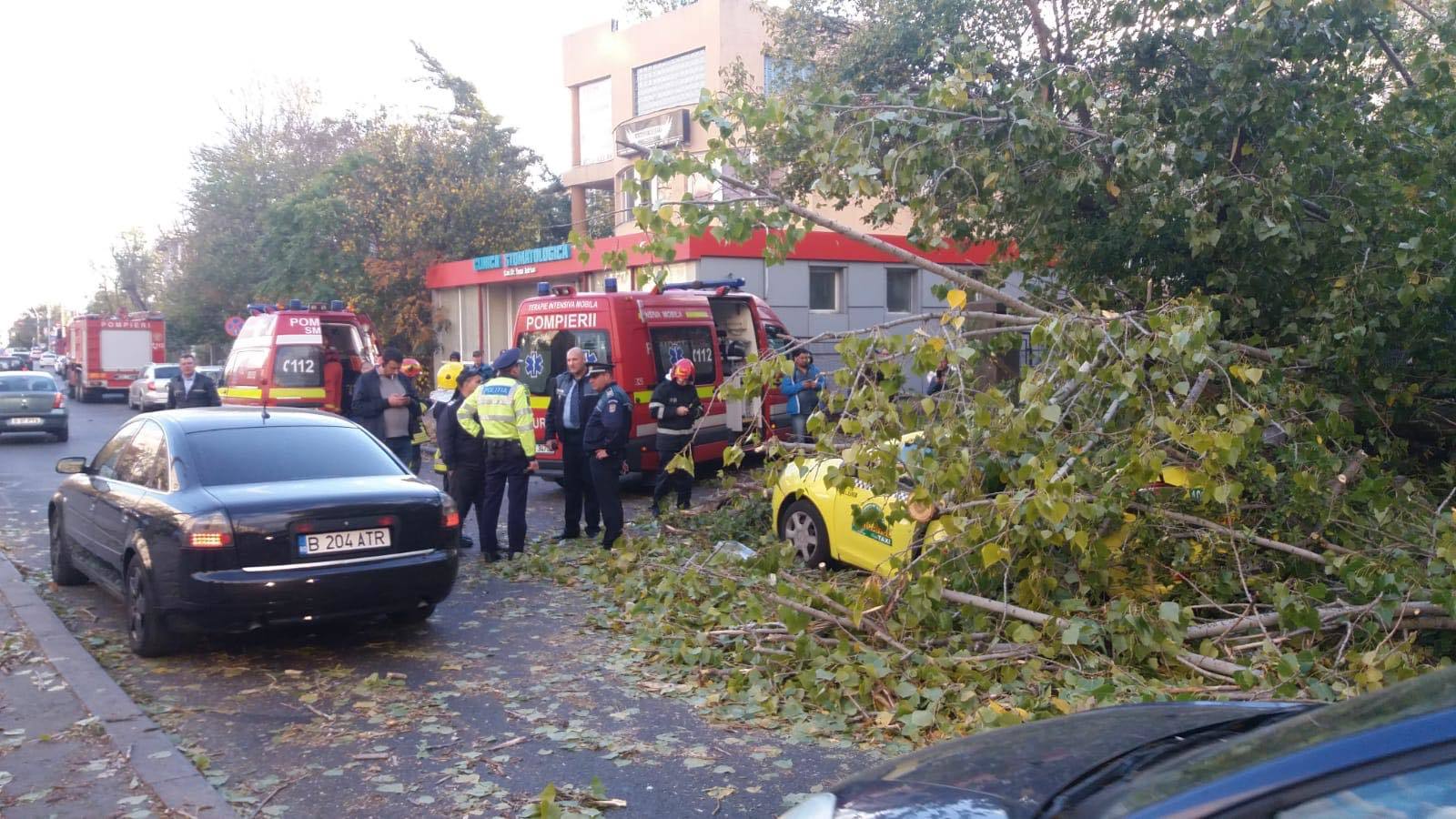 Un copac doborât de vântul puternic a căzut pe maşina în care se afla bărbatul şi l-a rănit grav. Acesta staţiona pe o stradă din zona Şoseaua Giurgiului. Conform martorilor, bărbatul a fost preluat de SMURD, după ce a fost scos de sub crengile copacului.