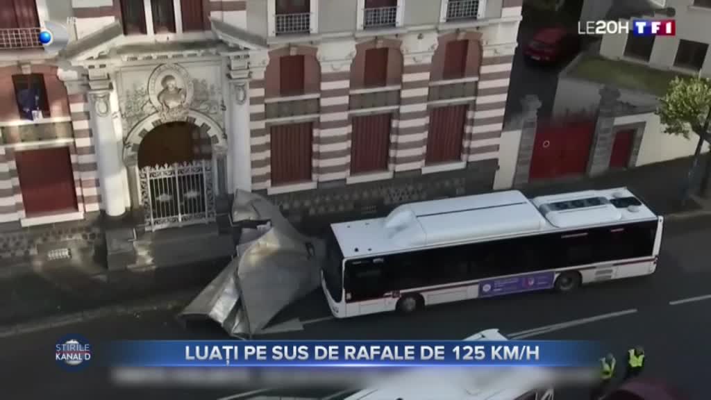 Bucată de acoperiș smulsă de forța vântului a ajuns apoi într-un autobuz parcat, pe care l-a distrus in totalitate. Din fericire, nimeni nu a fost rănit.