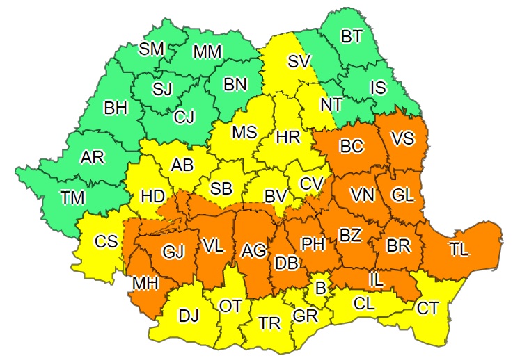 Administrația Națională de Meteorologie (ANM) a emis, miercuri dimineață, noi avertizări cod galben și cod portocaliu de instabilitate atmosferică accentuată care se suprapune peste vremea extrem de călduroasă. Vezi mai jos HARTA județelor afectate de avertizările meteo.