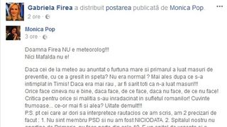 Ca raspuns, Gabriela Firea a distribuit pe Facebook postarea facuta de medicul Monica Pop, cu privire la acest eveniment.