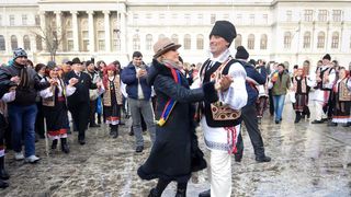 Fete si baieti imbracati in costume populare au dansat si i-au invitat in Hora Unirii pe participantii la spectacol. Cativa oameni au fluturat drapeluri si au dansat alaturi de ansamblurile folclorice.