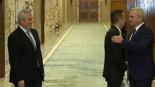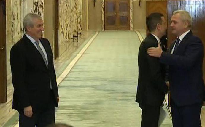Cu imbratisari si pupaturi si-a inceput premierul Sorin Grindeanu mandatul. Pana la usa il insotesc cei doi sustinatori. Calin Popescu Tariceanu ii stringe mana cu putere. Liviu Dragnea pare chiar emotionat. Ba chiar il pupa pe Grindeanu, sa-i fie cu noroc.