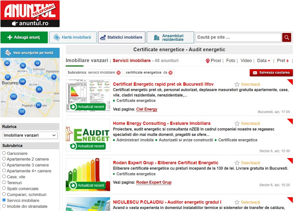 Vei putea vedea astfel cele mai noi anunțuri pentru firme și auditori specializați în eliberarea de certificate de performanță energetică în București. Pentru fiecare furnizori afli ce tip de servicii oferă, care sunt prețurile practicate în funcție de spațiul de evaluat și datele de contact.