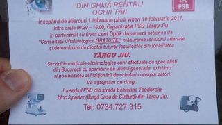 Potrivit informatiilor de pe invitatie, incepand de miercuri 1 februarie pana vineri 10 februarie 2017, Organizatia PSD Targu Jiu in parteneriat cu o firma oftalmologica demareaza actiunea de "Consulatii Oftalmologice Gratuite", masurarea tensiunii arteriale si determinarea de dioptrii tuturor locuitorilor din Targu Jiu.