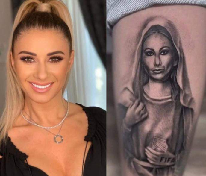 Tatuajul o reprezintă pe Anamaria Prodan care ține în mână un pumn de dolari încasați de la FIFA.