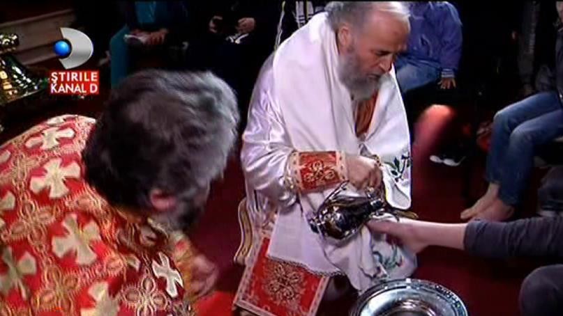 Urmand randuiala sfanta, arhiepiscopul s-a legat cu un stergar, asemenea Mantuitorului, si a spalat picioarele celor mai nevinovati dintre slujitori, 12 la numar, precum sfintii apostoli.