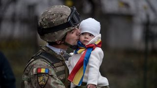 Dar poate cea mai tare fotografie surprinsă în acest an de jurnaliști este cea a unui militar care își îmbrățișează și își pupă fetița înainte de a începe defilarea.