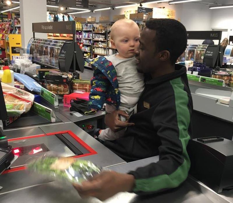L-a luat pe baietel in brate, in timp ce, cu cealalta mana, scana produsele. Femeia a inregistrat momentul si l-a postat pe internet, multumind barbatului si laudand profesionalismul acestuia.
