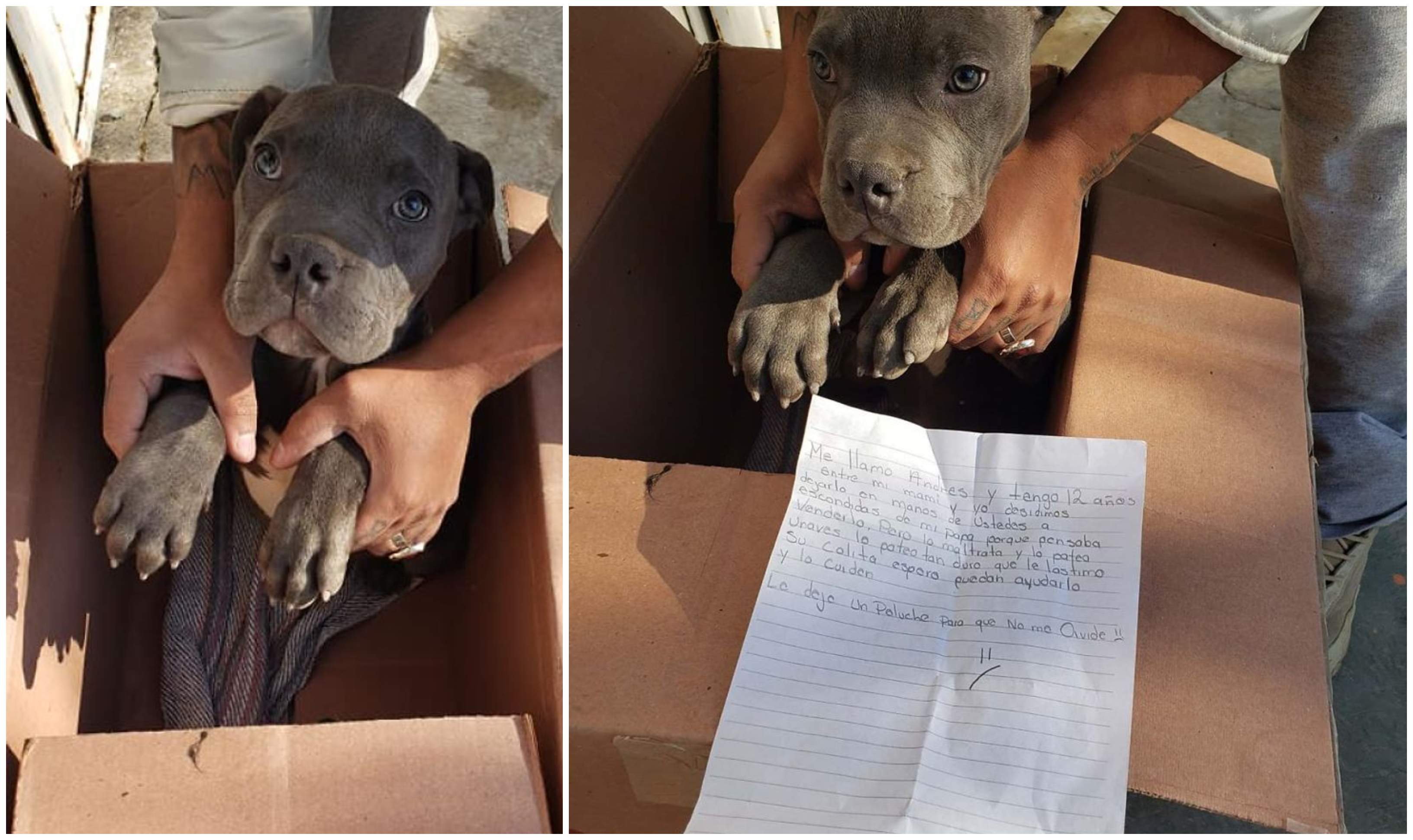 Animalul de companie a fost pus într-o cutie cu o jucărie de pluș și un bilețel lăsat la ușa unui adăpost de animale în speranța că micul lui prieten va reuși să ducă o viață mai bună, departe de violență, durere și teamă.