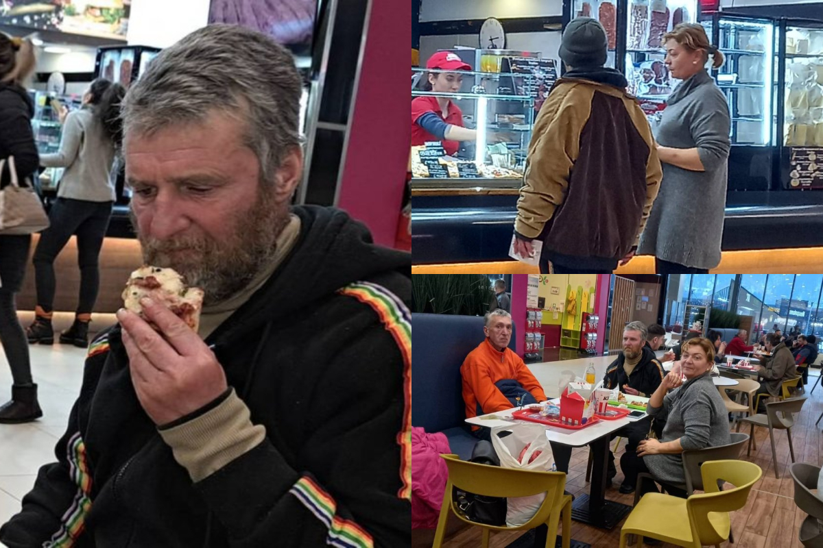 Gestul inedit al unei femei care a ales să ia masa cu un om nevoiaș la un fast-food. S-au trezit cu paza lângă ei