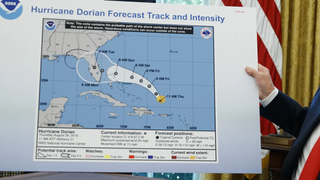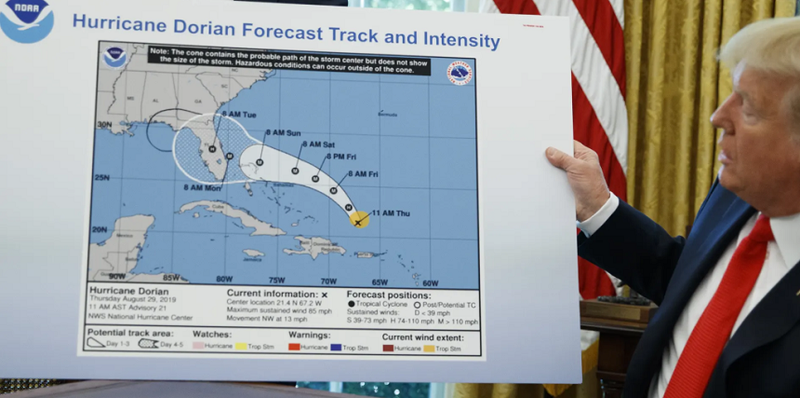 Cu intensitate restabilită la 3, uraganul Dorian se îndreaptă spre Florida. Pe harta din 29 august de la National Hurricane Center (NHC) prezentată de preşedinte, pe care erau expuse traseul şi intensitatea uraganului, cu un marker negru a fost adăugată o curbă, extinzând cursul din Florida în Alabama.