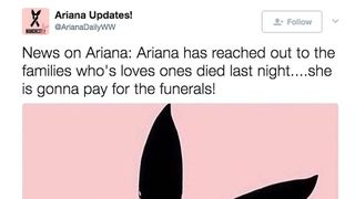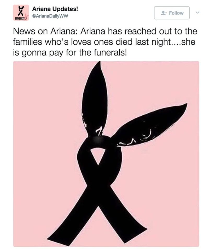 Ariana Grande, artista care sustinea un concert in Arena din Manchester, a facut un gest superb pentru victimele atentatului terorist. Echipa ei de comunicare a anuntat oficial ca artista va suporta costurile inmormantarilor celor decedati. Anuntul a fost facut pe pagina de Twitter a artistei.