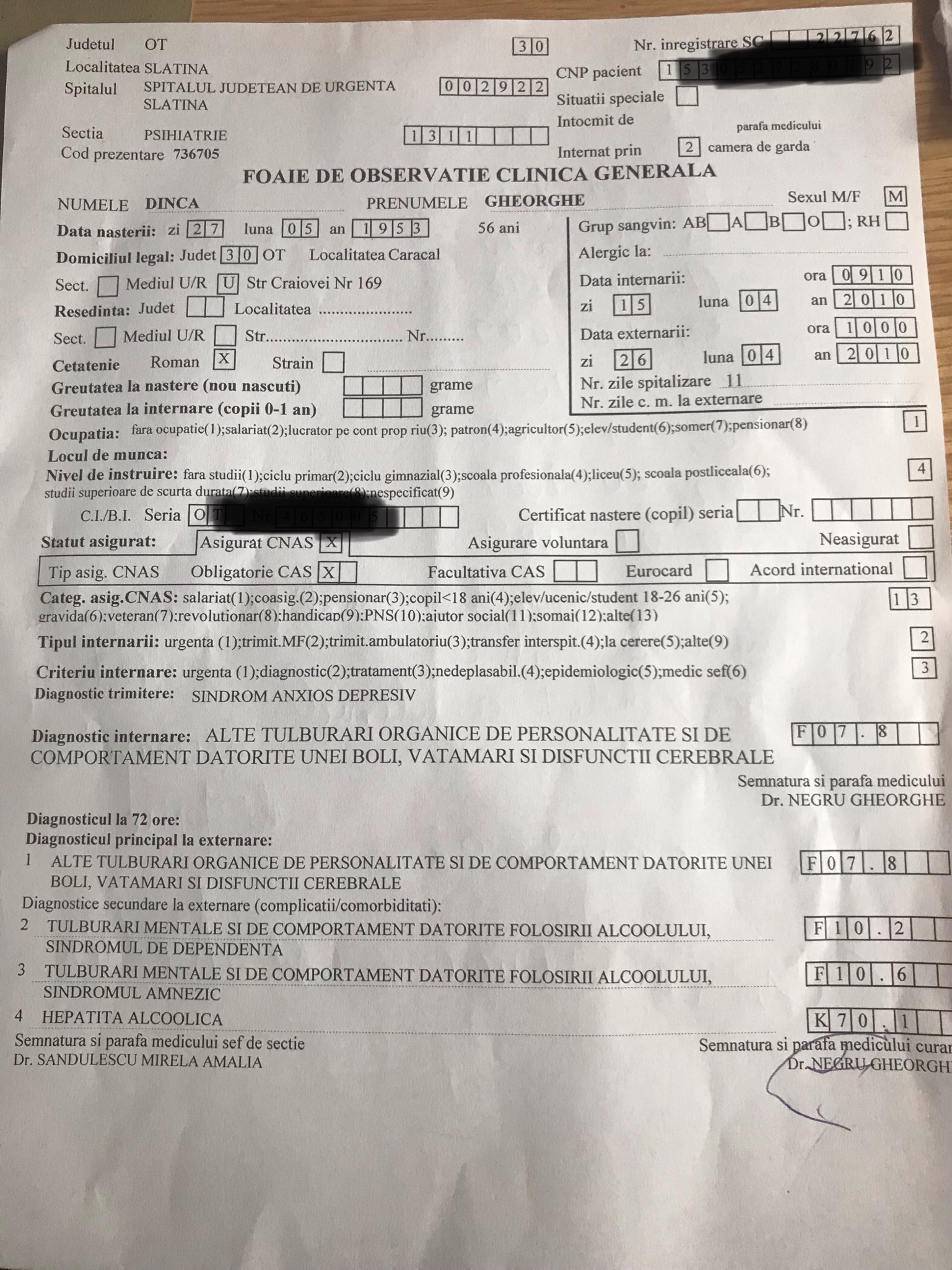 În urma investigațiilor realizate de gazetaoltului.ro, am ajuns în posesia unor documente care demonstrează că Dincă Gheorghe, omul ce a îngrozit o lume întragă cu faptele sale, este NEBUN cu acte. Criminalul a fost internat de mai multe ori la secția de Psihiatrie pe urma tulburărilor mentale și de comportament datorite folosirii alcoolului, sindromul de dependență.