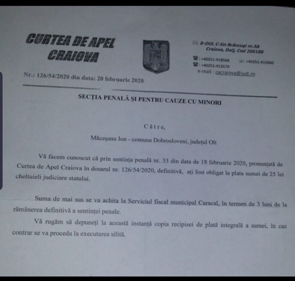 Alexandra Cumpănașu nu a mai răbdat și a făcut publică. pe contul său oficial de socializare, o fotografie în care apare decizia Curţii de Apel Craiova în ceea ce priveştea cererea de strămutare a dosarului în care este implicată nepoata sa. Ion Măceşanu, tatăl Alexandrei Măceşanu, a fost obligat la plata sumei de 25 de lei, cheltuieli judiciare.