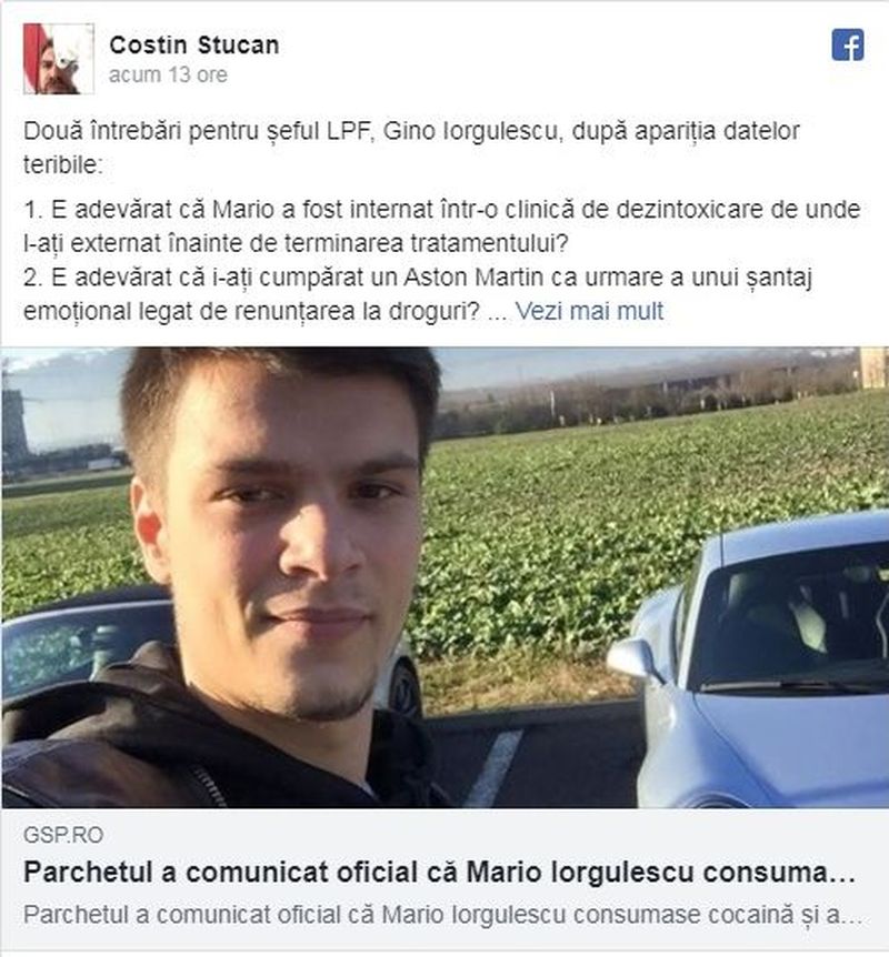 „Două întrebări pentru șeful LPF, Gino Iorgulescu, după apariția datelor teribile: 1. E adevărat că Mario a fost internat într-o clinică de dezintoxicare de unde l-ați externat înainte de terminarea tratamentului? 2.