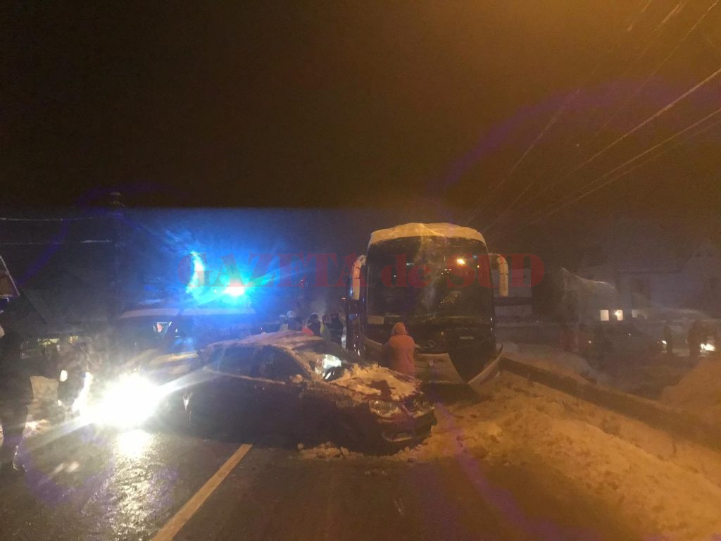 Gorj. Un autobuz cu 20 de pasageri a lovit în plin o maşină care ieşea din curte fără ca şoferul să se asigure