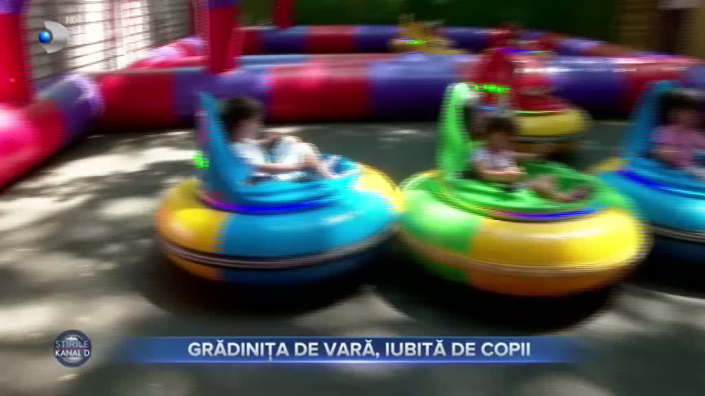 Așa arată curtea unei grădinițe de vară din Sectorul 1 al Capitalei. Baloane, tobogane gonflabile și multe alte atracții pentru cei mici. Pentru că e vacanță, cea mai mare parte din zi e dedicată distracției și relaxări, chiar dacă cei mici n-au cunoscut încă ce e stresul.
