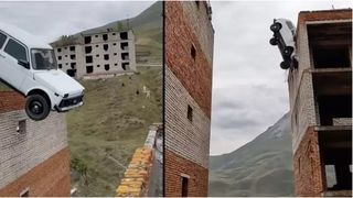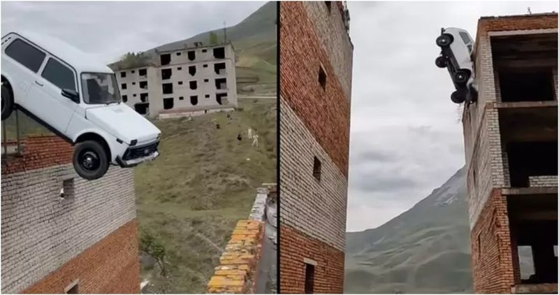 3 din 3 | VIDEO. Greșeala fatală a unui cascador rus. A încercat să sară cu o Lada de pe o clădire pe alta, dar lucrurile au mers prost