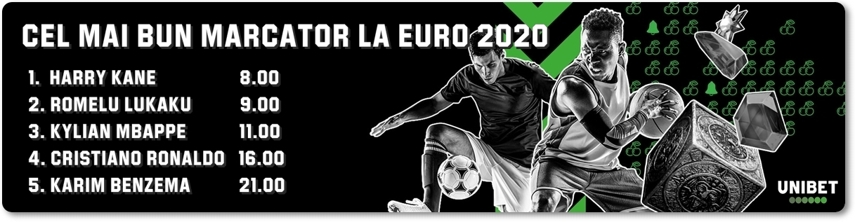 Se poate paria, desigur, și pe marcatori, favoriți fiind Harry Kane (cotă 8.00), Romelu Lukaku (cotă 9.00), Kylian Mbappe (cotă 11.00), Cristiano Ronaldo (cotă 16.00) și Karim Benzema (cotă 21.00). Multe alte opțiuni pot fi descoperite pe unibet.ro, inclusiv diferite combinații de echipe care să joace finala, Cel mai bun jucător, Cel mai bun tânăr jucător etc.