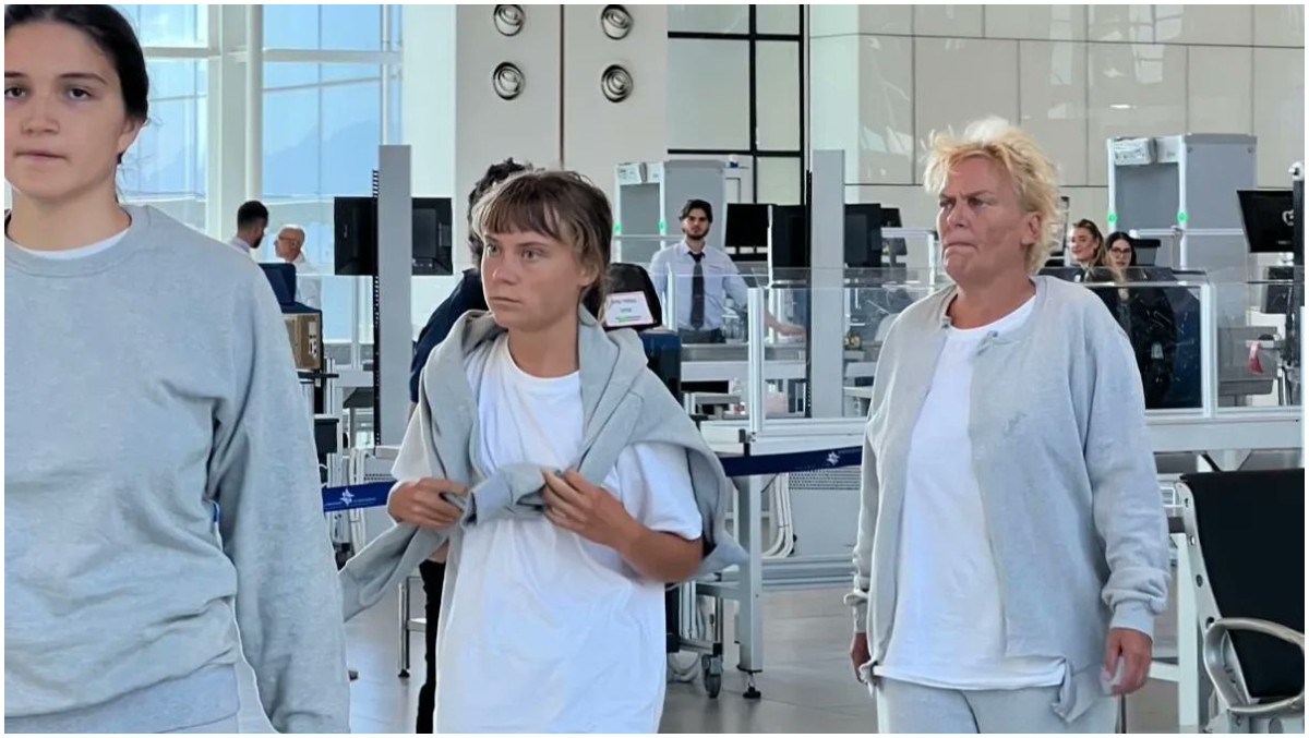 În fotografiile postate de ministerul israelian Greta Thunberg și alte două activiste, aflate pe aeroportul Ben Gurion din Tel Aviv, erau îmbrăcate în treningurile gri folosite în închisorile israeliene.