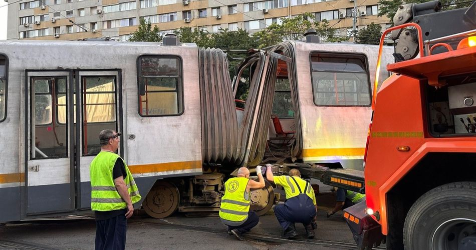 3 din 3 | Haos în Capitală! Un tramvai a deraiat și aproape s-a rupt de la jumătate, la scurt timp după ce a ieșit din depou