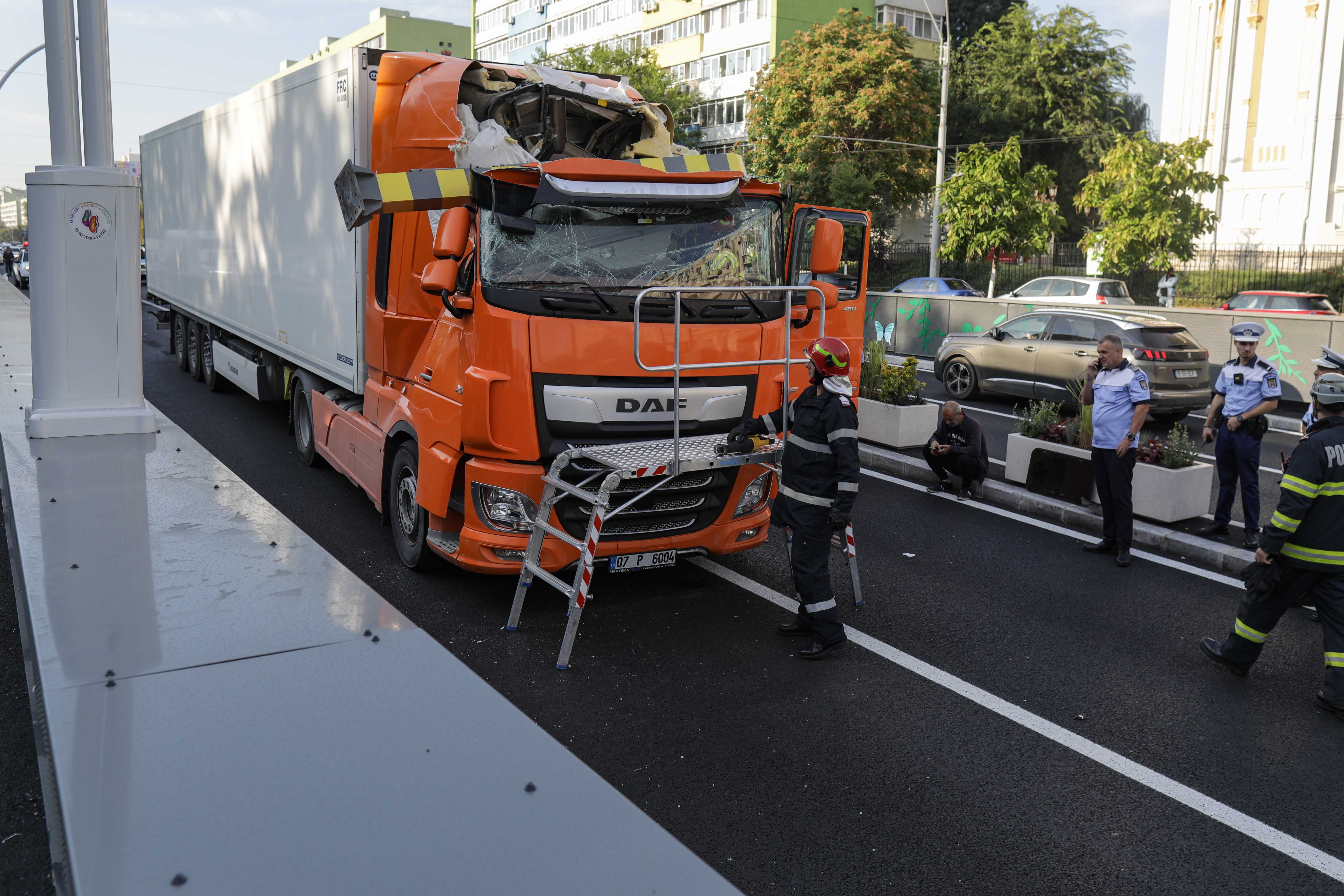 1 din 6 | Haos în traficul din centrul Capitalei, după ce un TIR a lovit limitatorul de înălțime din Pasajul Unirii
