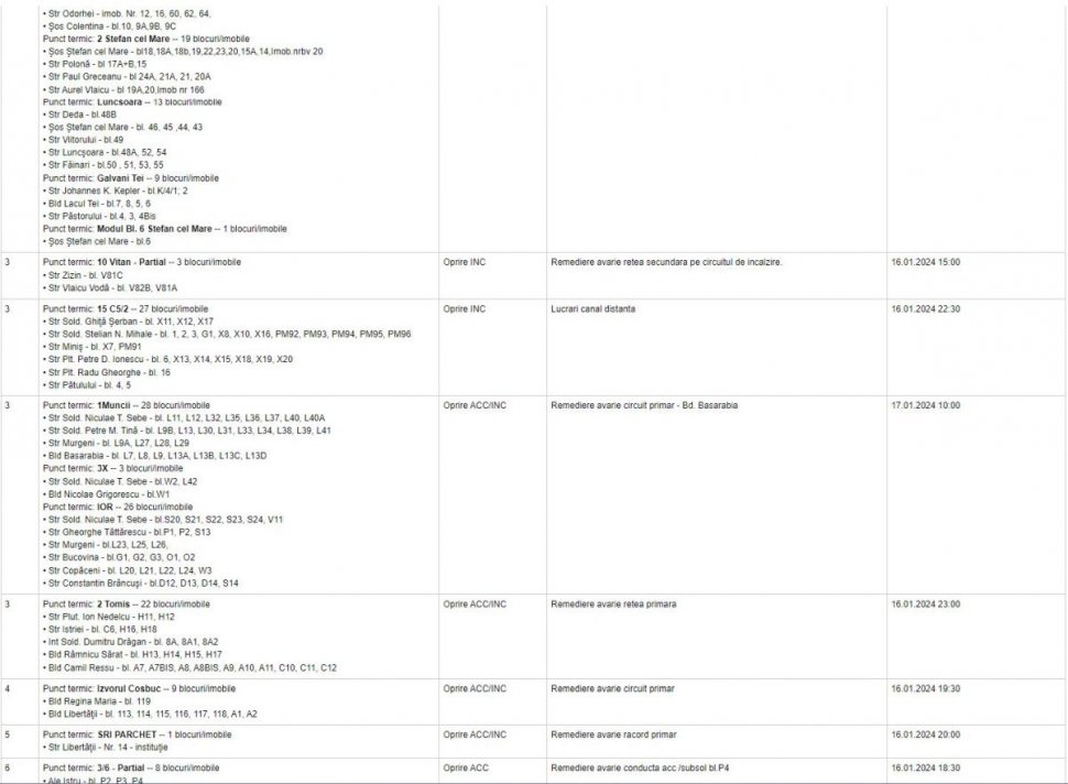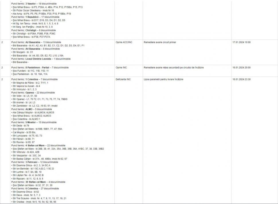 În cazul în care vă confruntați cu probleme privind furnizarea agentului termic pentru apă caldă și/sau căldură, iar adresa dumneavoastră nu se regăsește în listele publicate pe site, vă rugăm să vă adresați dispeceratelor de sector sau operatorilor call-center la numerele: TELVERDE- 0800 820 002 (apel gratuit) și 031 9442, aflate la dispoziția dumneavoastră 24 de ore din 24, pentru înregistrarea sesizării și verificarea ulterioară a situației", a anunțat compania pe site.