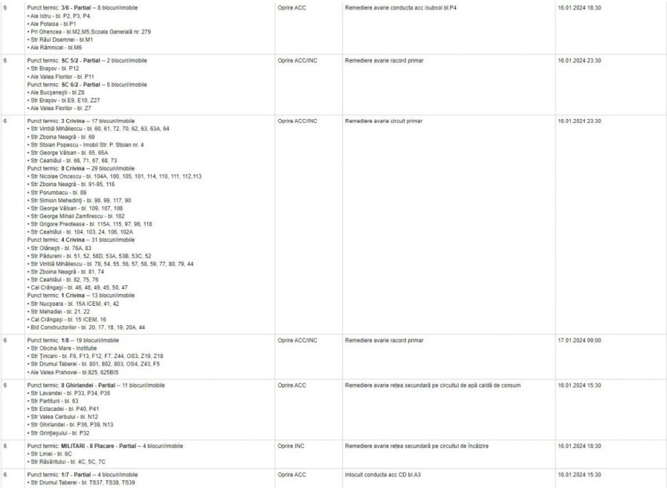 "Compania Municipală Termoenergetica București S.A. anunță oprirea agentului termic, pentru remedierea avariilor apărute în rețeaua termoficare, în mai multe zone.