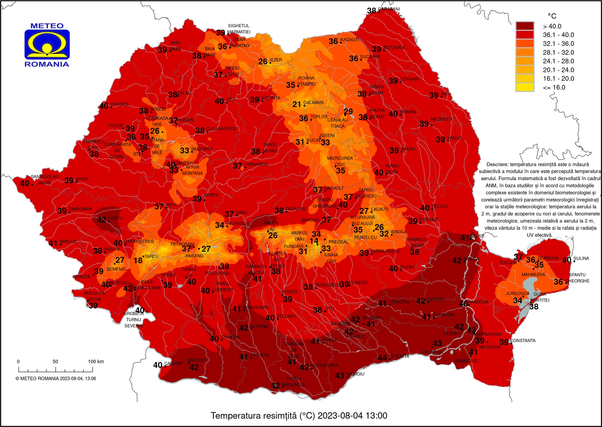Ora 13:00- Temperaturi resimțite: 44 grade Oltenița; 43 grade Giurgiu; 43 grade Călărași; 43 grade Cernavodă; 42 grade București; 42 grade Turnu Măgurele; 42 grade Băile Herculane; 42 grade Lugoj; 42 grade Fetești; 42 grade Alexandria; 42 grade Brăila; 42 grade Slatina