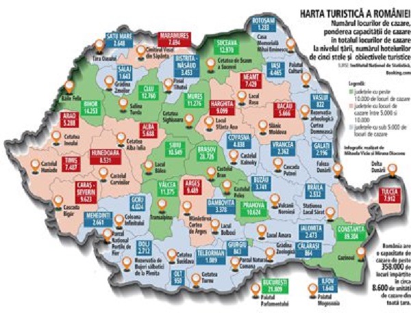 Harta turistică a României. România este cunoscută pentru zonele sale cu peisaje, pentru locurile pline de istorie, cu tradiții . În ultimii ani, România a devenit una din țările cu destinații preferate de turiștii străini.
