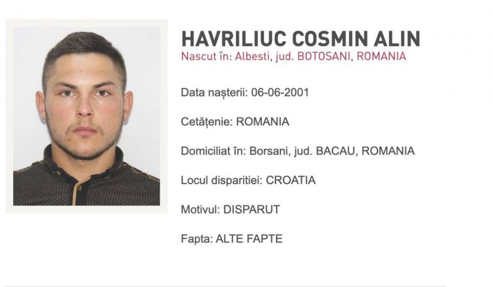 Havriliuc Alin Cosmin a plecat la muncă în Croaţia. Acesta a fost dat dispărut. Familia sa nu a mai putut lua legătura cu el de pe data de 1 noiembrie.
