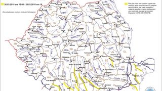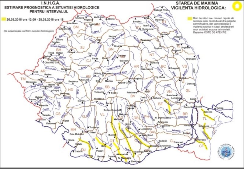 In intervalul 26.03.2018 ora 12:00 – 28.03.2018 ora 18:00 pe raurile din bazinele hidrografice: Desnatui (judetele: Mehedinti si Dolj), Olt – afluentii aferenti sectorului aval Ac. Babeni (judetele: Valcea, Olt si Dolj), Calmatui (judetele: Olt si Teleorman), Vedea- bazin superior si afluenti bazin mijlociu si inferior (judetele: Olt, Arges si Teleorman), Neajlov (judetele: Arges, Dambovita, Teleorman si Giurgiu), Buzau – afluenti bazin mijlociu (judetul Buzau), raurile mici din Dobrogea (judetele: Constanta si Tulcea).