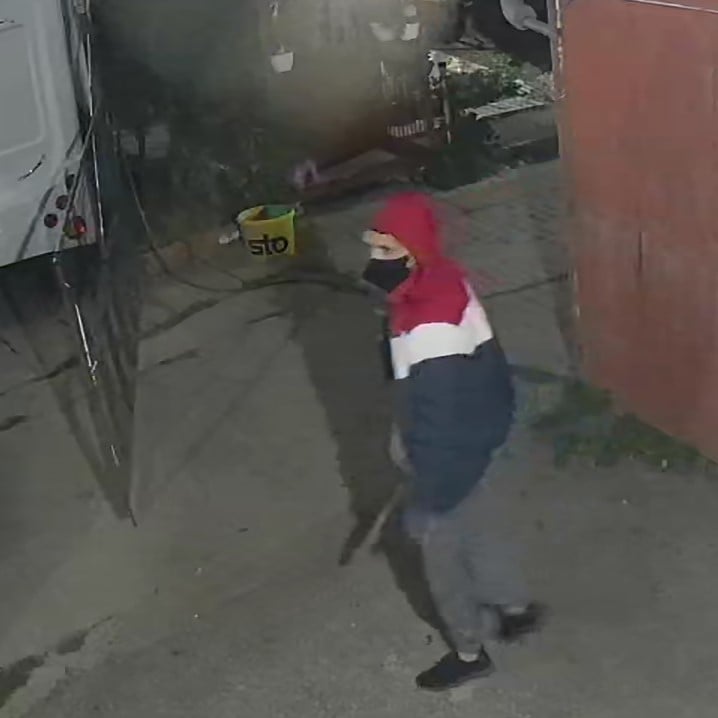 Înarmat cu un par și cu chipul acoperit pe jumătate cu un fular, acest hoț escaladează gardul unei familii din Timișoara și reușește să intre, fără zgomot, în curte.