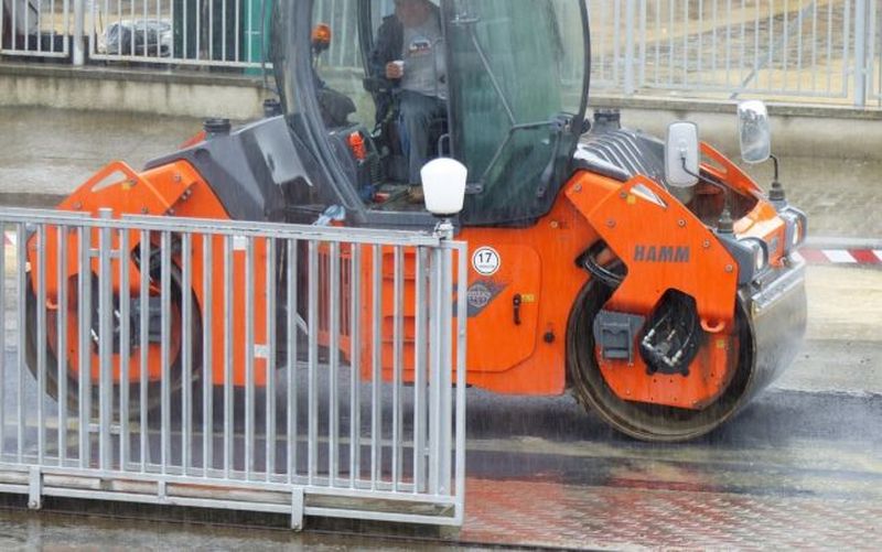 Hunedoara: Mai multi muncitori asfalteaza de zor pe o ploaie torentiala.