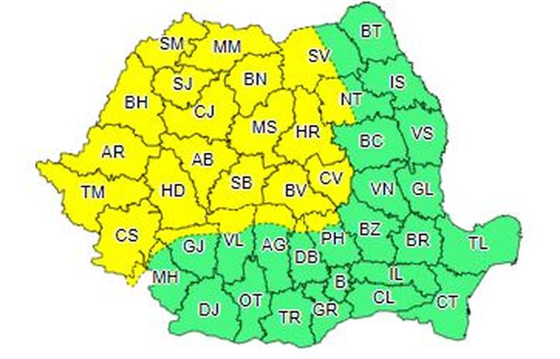 Administraţia Naţională de Meteorologie a emis două atenţionări cod galben de vreme severă, valabile în 24 de judeţe, începând din dimineaţa zilei de luni.