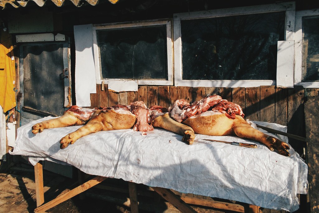 Tăierea porcului se face prin înjunghiere, iar apoi animal este pârlit, spălat cu mălai, apoi învelit cu pătura.